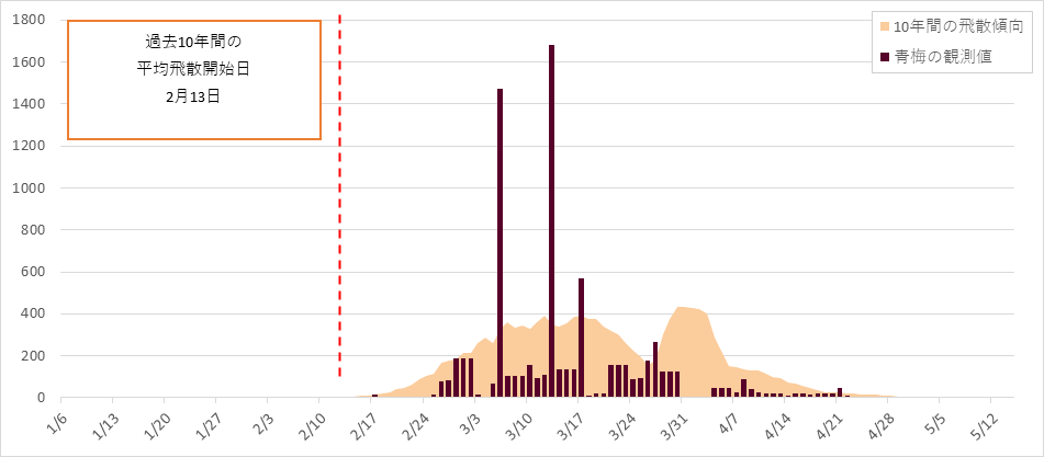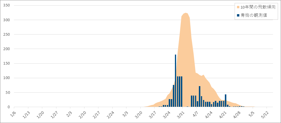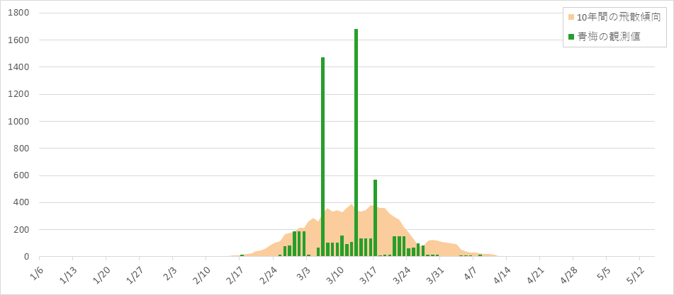 トップページ > 東京都の花粉情報 > 過去の飛散花粉数データ > 令和7年地点毎の花粉飛散状況:青梅 令和7年地点毎の花粉飛散状況:青梅 区部 千代田 葛飾 杉並 北 大田 多摩地区 青梅 八王子 多摩 町田 立川 府中 小平 12地点の合計 測定地点:青梅 スギ・ヒノキ花粉の合計の飛散状況(個/cm2) 飛散花粉数データ:スギ・ヒノキ合計 スギ花粉の飛散状況(個/cm2) 飛散花粉数データ:スギ ヒノキ花粉の飛散状況(個/cm2) 飛散花粉数データ:ヒノキ