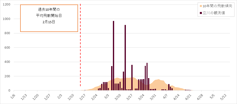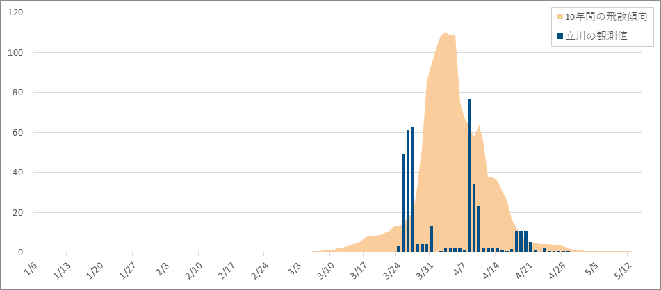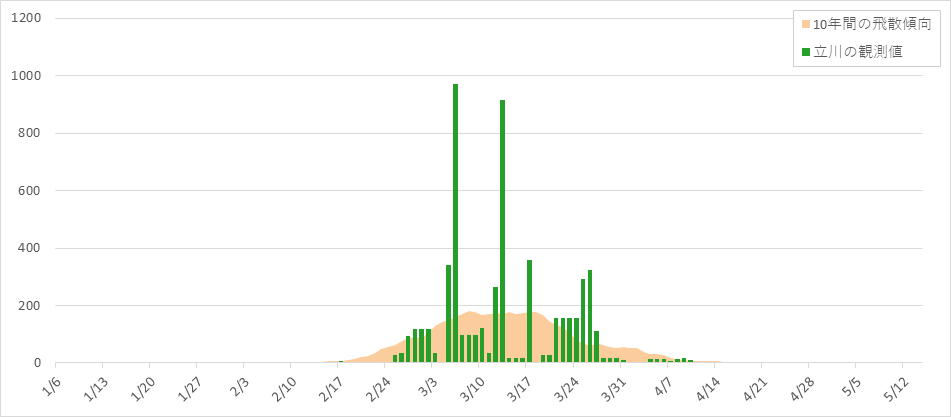 トップページ > 東京都の花粉情報 > 過去の飛散花粉数データ > 令和7年地点毎の花粉飛散状況:立川 令和7年地点毎の花粉飛散状況:立川 区部 千代田 葛飾 杉並 北 大田 多摩地区 青梅 八王子 多摩 町田 立川 府中 小平 12地点の合計 測定地点:立川 スギ・ヒノキ花粉の合計の飛散状況(個/cm2) 飛散花粉数データ:スギ・ヒノキ合計 スギ花粉の飛散状況(個/cm2) 飛散花粉数データ:スギ ヒノキ花粉の飛散状況(個/cm2) 飛散花粉数データ:ヒノキ