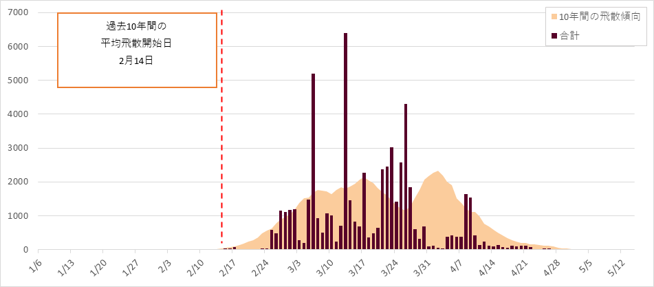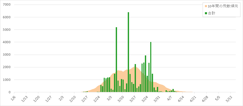 トップページ > 東京都の花粉情報 > 過去の飛散花粉数データ > 令和7年地点毎の花粉飛散状況:12地点の合計 令和7年地点毎の花粉飛散状況:12地点の合計 区部 千代田 葛飾 杉並 北 大田 多摩地区 青梅 八王子 多摩 町田 立川 府中 小平 12地点の合計 測定地点:12地点合計 スギ・ヒノキ花粉の合計の飛散状況(個/cm2) 飛散花粉数データ:スギ・ヒノキ合計 スギ花粉の飛散状況(個/cm2) 飛散花粉数データ:スギ ヒノキ花粉の飛散状況(個/cm2) 飛散花粉数データ:ヒノキ