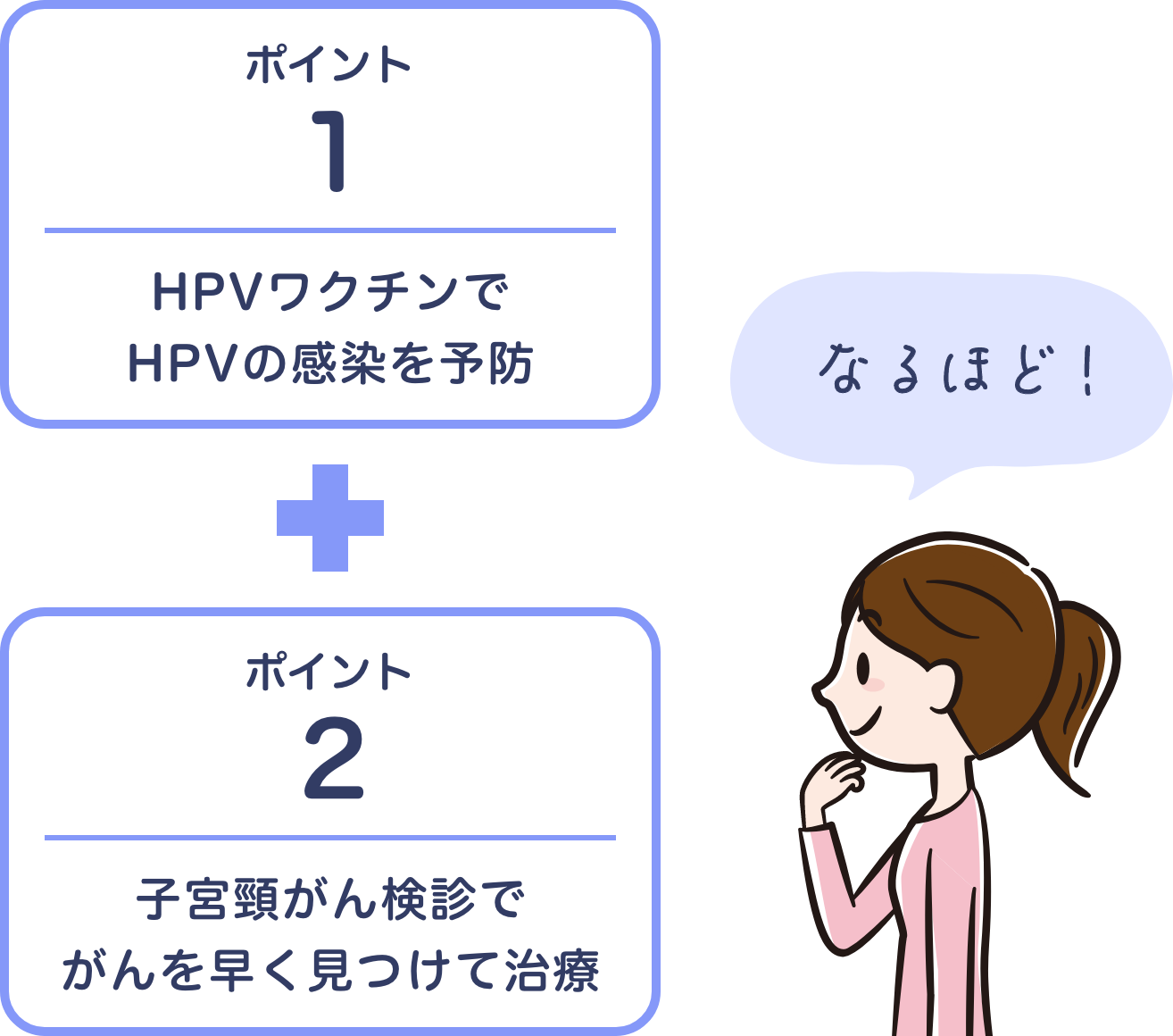 子宮頸がんで苦しまないために、私たちができることは、HPVワクチンの接種と子宮頸がん検診の受診の2つです。