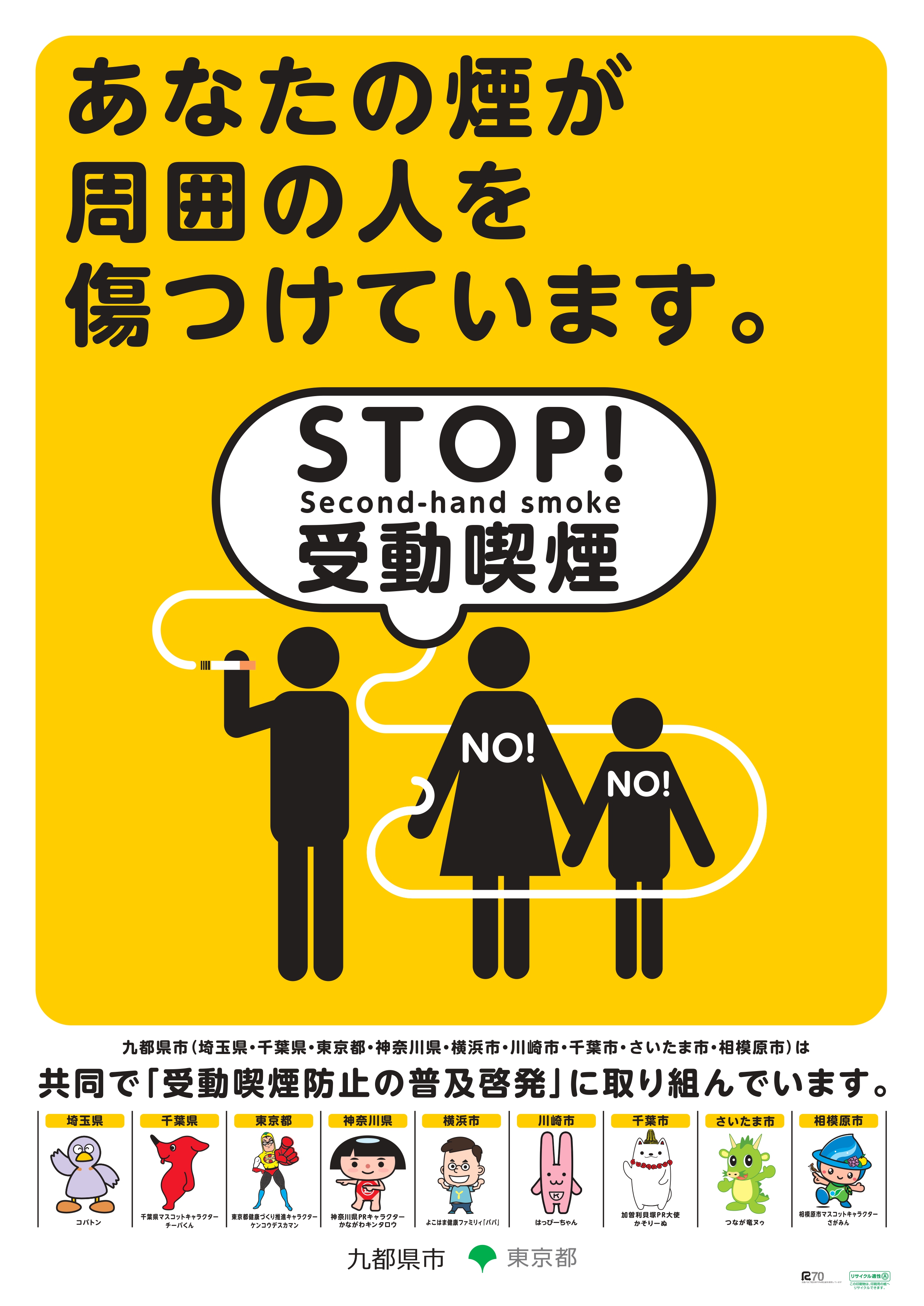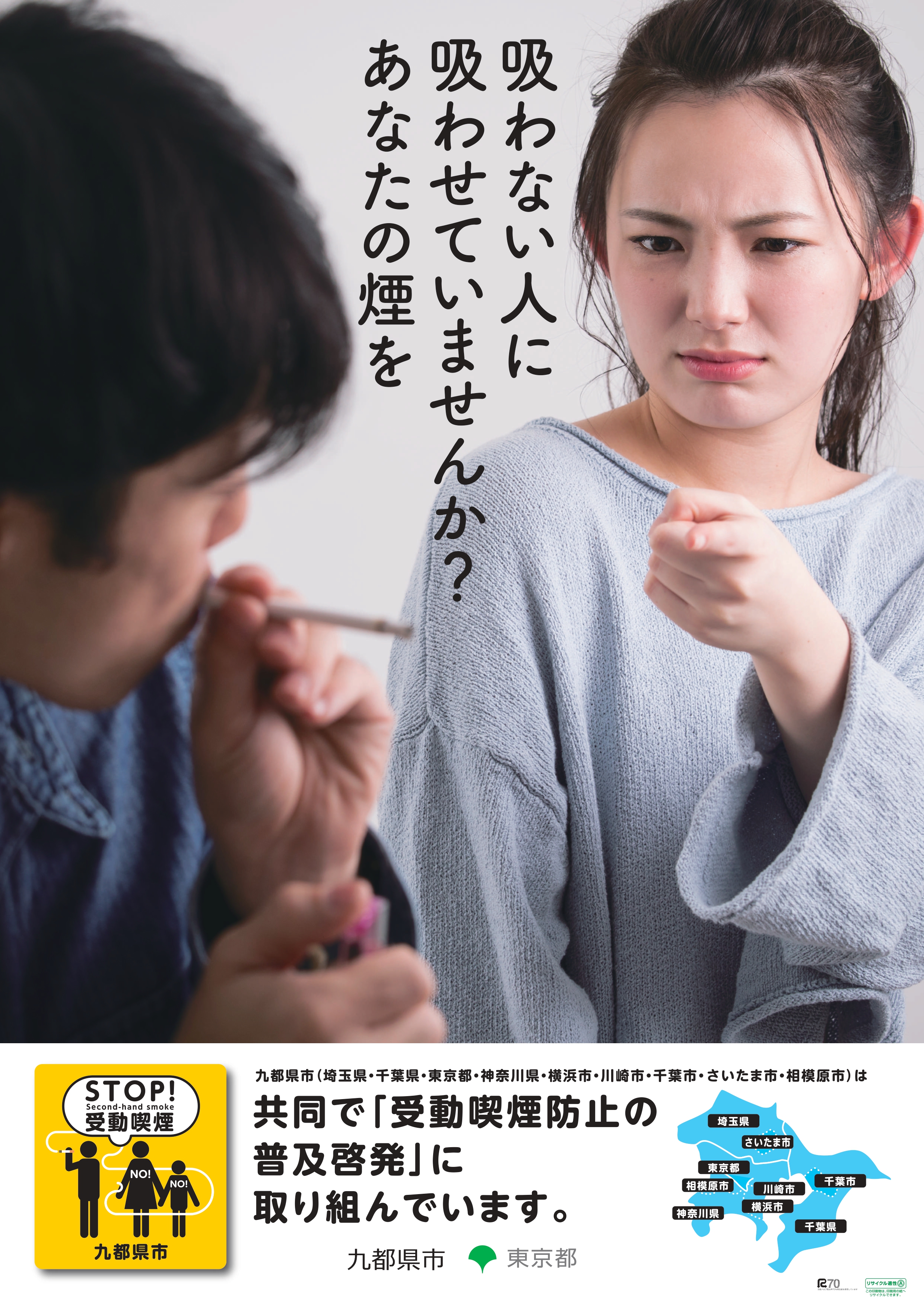東京都では、九都県市(埼玉県、千葉県、東京都、神奈川県、横浜市、川崎市、千葉市、さいたま市、相模原市)共同キャンペーン用ポスターを作成しています。毎年、がん征圧月間の9月から11月にかけて、駅ばりを中心として都内各地で掲示し、受動喫煙防止について広く普及啓発を行っています。