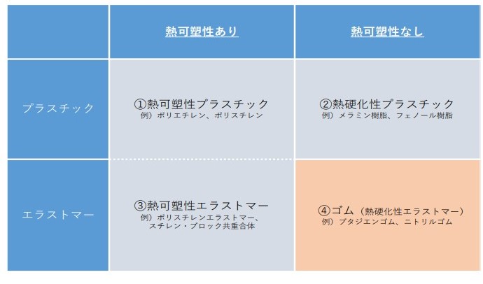(例)・熱可塑性を持たない弾性体(ゴムの原材料に該当する物質)