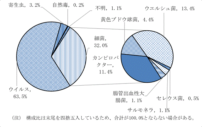 | その他 | 84 | 1,210 | 62.7 | 92.5 | 飲食店の食事52件(NV33件、Camp11件、C.p3件、Sal2件、EHEC2件、不明1件)/飲食店の食事(鶏肉料理を含む。)5件(Camp5件)/弁当5件(NV3件、Sta2件)/給食4件(NV2件、C.p1件、RVA1件)/飲食店の食事(加熱不十分な鶏肉を含む。)2件(Camp2件)/飲食店の食事(加熱不十分な鶏肉料理を含む。)2件(Camp2件)/飲食店の食事(加熱不十分な鶏レバー料理を含む。)2件(Camp2件)/飲食店の食事(生食用牡蠣を含む。)2件(NV2件)/飲食店の食事(加熱不十分な鶏肉等を含む。)(Camp)/飲食店の食事(加熱不十分な焼き鳥を含む。)(Camp)/飲食店の食事(生食用殻付き牡蠣を含む)(NV)/飲食店の食事(焼き牡蠣、牡蠣フライを含む。)(NV)/飲食店の食事(焼き鳥を含む。)(Camp)/海鮮ばらちらし弁当(NV)/ケータリングの食事(C.p)/子ども食堂の食事(EHEC)/チキンオーバーライス弁当(C.p)/ローストビーフ弁当(B.c) | |