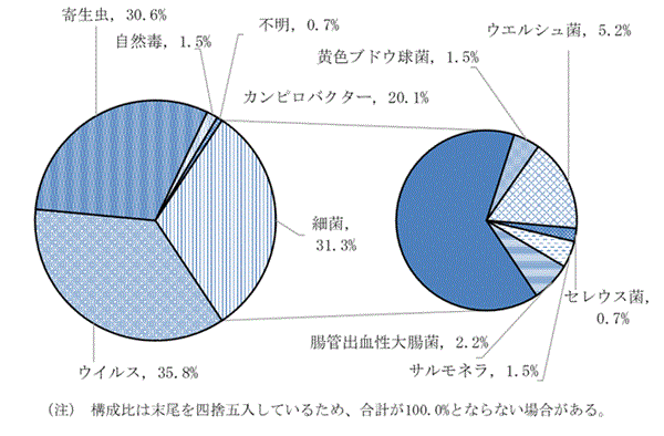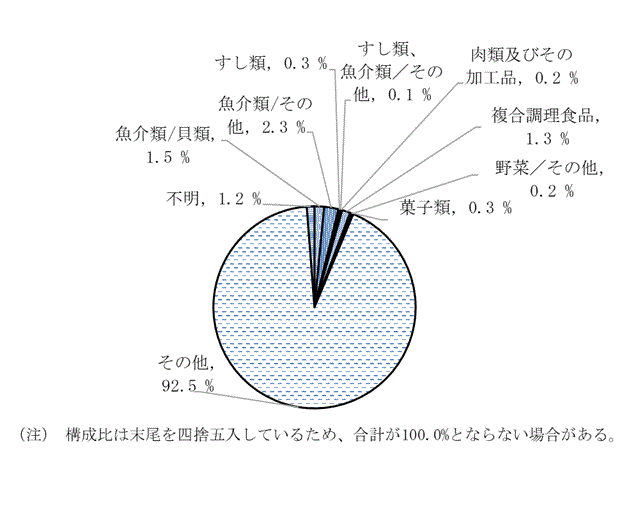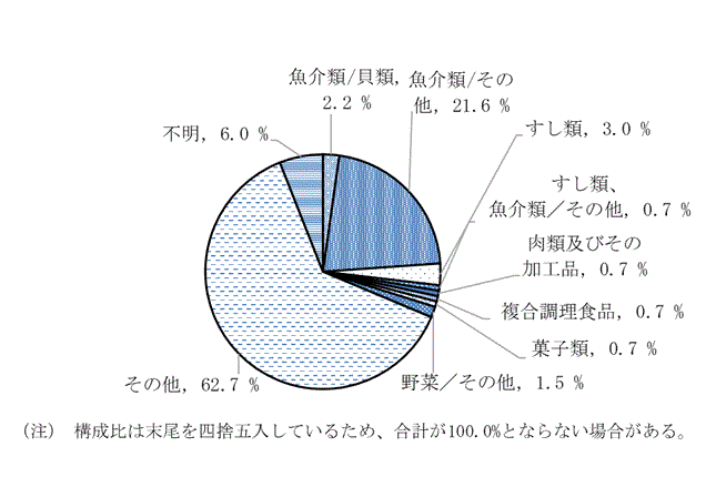 | 不明 | 14 | 90 | 10.4 | 6.9 | ケータリングの食事(C.p)/しめさば(推定)(寄ア)/鮮魚介類(推定)(寄ア)/生魚(寄ア)/不明10件(寄ア9件、Camp1件) | |