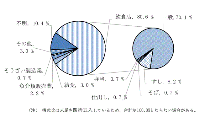 | 飲食店 | 一般 | 94 | 810 | 70.1 | 61.9 | 飲食店の食事53件(NV31件、Camp11件、C.p3件、寄ア3件、Sal2件、EHEC2件、不明1件)/飲食店の食事(鶏肉料理を含む。)5件(Camp5件)/刺身盛合せ3件(寄ア3件)/イワシのマリネ2件(寄ア2件)/飲食店の食事(加熱不十分な鶏肉を含む。)2件(Camp2件)/飲食店の食事(加熱不十分な鶏肉料理を含む。)2件(Camp2件)/飲食店の食事(加熱不十分な鶏レバー料理を含む。)2件(Camp2件)/飲食店の食事(生食用牡蠣を含む。)2件(NV2件)/生食用殻付き牡蠣2件(NV2件)/弁当2件(NV2件)/あんみつ(NV)/飲食店の食事(海鮮丼を含む。)(寄ア)/飲食店の食事(加熱不十分な鶏肉等を含む。)(Camp)/飲食店の食事(加熱不十分な焼き鳥を含む。)(Camp)/飲食店の食事(生鮮魚類を含む。)(寄ア)/飲食店の食事(鮮魚介類を含む。)(寄ア)/飲食店の食事(生食用殻付き牡蠣を含む)(NV)/飲食店の食事(焼き牡蠣、牡蠣フライを含む。)(NV)/飲食店の食事(焼き鳥を含む。)(Camp)/加熱不十分な鶏肉料理(Camp)/しめさば及びカツオを含む刺身盛合せ並びにサバ寿司(寄ア)/生食用牡蠣(NV)/生食用魚介類(キンメダイの刺身及びホウボウの刺身を含む。)(寄ア)/生食用鮮魚介類(イワシ)(寄ア)/生食用鮮魚介類(サバ)(寄ア)/生食用鮮魚介類(マグロ、マダイ、ブリ、ツバメウオ、マトウダイを含む。)(寄ア)/生食用鮮魚介類(ブリ、アジ、サンマ、カワハギ、カツオを含む。)(寄ア)/バイケイソウ類のおひたし(植物)/ローストビーフ弁当(B.c) |