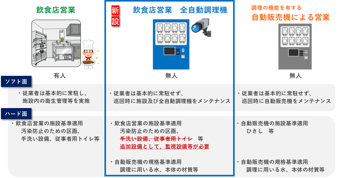 全自動調理機は、自動的に食品を調理し、調理された食品を提供する機能を有する調理器具です。調理の機能を有する自動販売機と同等以上の材質、構造、機能を有することが求められます。今までの営業形態との違い、求められる施設の基準等は?
